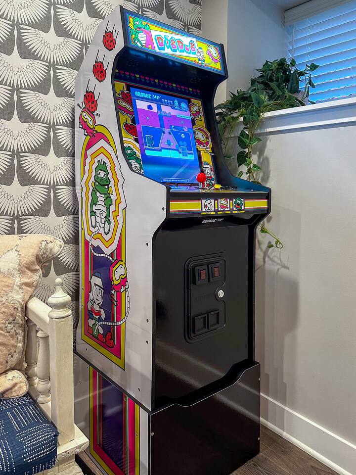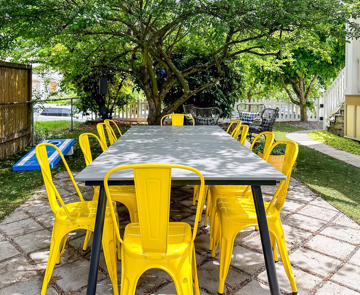 The Vibrant Victorian is uniquely set up for groups who want to be together without being on top of each other. Two full kitchens, two living areas, and two dining spaces mean you're never competing for the coffee maker or the couch — and if part of your group keeps different hours or just needs a quieter corner, the three-level layout makes that easy. MAIN LEVEL The social heart of the home: - Living room with 65" 4K Roku TV - Dining area - Full kitchen with cozy eat-in nook - Bright, airy bedroom with king bed - Bedroom with two twin beds (great for kids) - Full bathroom with tub/shower combo TOP LEVEL The quieter, more private floor: - Open office area with monitor, keyboard, and ergonomic chair — great for anyone who needs to sneak away for a call or a few hours of work - Full-size washer and dryer - Spacious bedroom with king bed and large 4K Roku TV - Full bathroom with walk-in shower LOWER LEVEL Where the fun happens: - Second full kitchen - Second living area with large Roku 4K TV - Dining area with vintage arcade machine (a house favorite) - Bedroom with queen bed and Fire TV - Bedroom with queen bed - Full bathroom with extra-deep soaking tub/shower, heated floors, and full-size stacked washer/dryer THE YARD - Patio with seating for 10 - Cornhole game The three-level layout means groups naturally find their rhythm — some claim the lower level, others take the top floor, everyone meets in the middle. Or ignore all that and use it however works for you. Either way, check your dates and come see why guests keep coming back.
